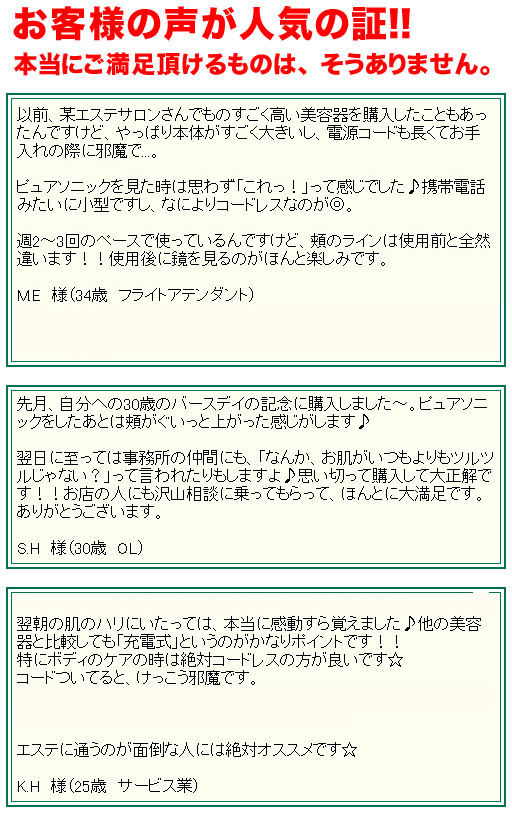 は家庭用でありながら、エステ並の安定出力、そして連続使用を可能にした、高性能美容器具なのです。だから売れているんです!!