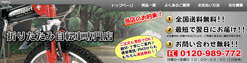 中古品や展示品、偽物などの販売は行っておりません。 折りたたみ自転車の購入に関しましてご不明な点がございましたら、お気軽にお電話ください。 フリーダイヤルですので気にすることなく、ご質問出来ます。