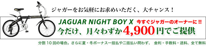 | 夜の闇にしかでてこないジャガーを、現地の人たちは「ナイトボーイ」と呼んでいました。 そんな「ナイトボーイ」をイメージした、エレガントさ、俊敏さや精悍さ、そして神秘さが魅力的な、JAGUAR NIGHT BOY X。 大人のあなたを演出するにふさわしいナイトボーイブラックと、ホワイトをご用意しました。 20インチのタイヤにシマノ製7段変速機を装備した、非常に機動性の高い折畳み自転車。もちろん非常にコンパクトに折り畳めます! 高級感たっぷりのデザインと充実の機能で、今もっとも人気のある1台。前回入荷後、即日完売しておりますので、ご希望の方は今すぐお電話でご予約を! |