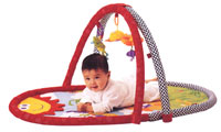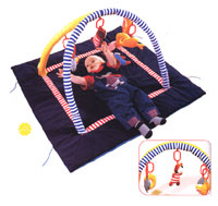 | 赤ちゃんの発達を促すしかけがいっぱいのプレイマット。バーとラトルは取りはずしができるので、おでかけに持っていくことができます。上質な布製で手ざわりもとてもやわらか。 |