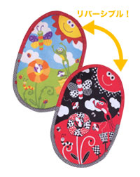 | 白黒と原色。色のコントラストにこだわったプレイジム。発達段階に応じて、表と裏を使いこなしましょう。取っ手についている遊具は取りはずしが可能。折りたたんでバッグのように持ち運ぶこともできます。 |