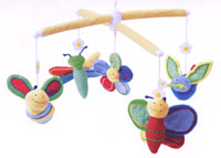 | オルゴールに合わせて、お花やとんぼやちょうちょなどがゆっくりと回転します。人形たちの顔が同じ方向に向いているので、寝ている赤ちゃんからよく見えるように、ベットサイドか足元に取りつけてあげましょう。 |