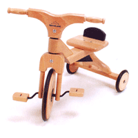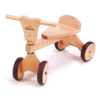 | 木製四輪車は三輪車より安定感があり、小さなお子様にも安心してお使いいただけます。タイヤはゴムで保護されているので、室内でも床を傷つけずに乗ることができます。 |
