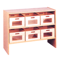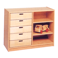 | 自分の遊び場の欲求を自分の意思決定し、行動にうつすこと。遊びの世界を広げること。遊びの終わりを自分で決めること。この3つは、子供にとってとても大切なことです。これらをできるようにするには、子供がひとりで遊び道具を出し、片付けることができる環境を大人が整えてあげることが必要です。この整理棚は、子供の目線に立って作られています。 |