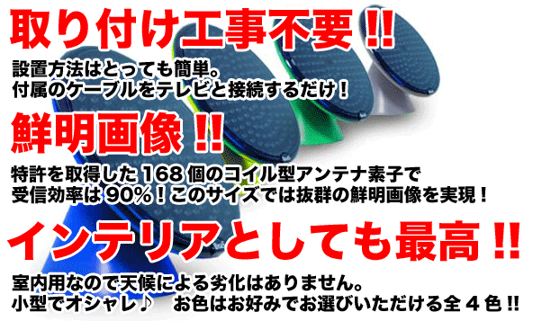 | 特 徴 詳 細 簡単!設置方法 ご購入者様体験談 価格・ご注文方法 返品・交換 受信できない? 会社概要 |