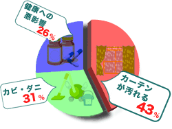 ■結露のここが嫌!1位: カーテンが汚れる 2位: カビ・ダニ 3位: 健康への悪影響 寒くなってきたこの季節、結露にお悩みの方、昨年悩まされた方、多くいらっしゃいます。 結露の影響として、一番に上がっていたのが、『カーテンの汚れ』。 朝起きると窓、及びカーテンがびしょびしょになっていた、汚れやカビでカーテンが汚らしくなってしまった等ご経験のある方が多いようです。 第2位は、『カビ、ダニの発生』。 結露が多い、窓際、押入の中、壁際に設置してある家具の裏側、脱衣場など、発生場所は様々のようです。空気が留まってしまい、周りとの温度差が出来やすい場所に多いようですね! 第3位は、『健康への悪影響』。 結露によってカビ、ダニが発生すれば、住環境は間違いなく、悪化します。健康への悪影響を心配される方も多く、特にまだ小さいお子さんをお持ちの方はご心配も当然だと思います。 |