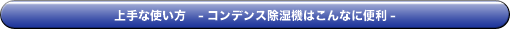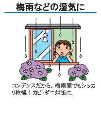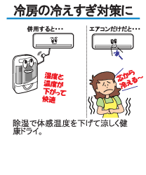 エアコンのドライ機能で冷えすぎを感じた事のある人は約半数もいると言われ、その大半は女性です。真夏の蒸し暑いときはエアコンを最も弱くし、コンデンス除湿機を運転させれば体感温度を下げられて快適になります。外出時の温度差が少なくなるので冷房特有のダルさ対策にもなります。 |