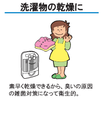 切タイマーをセットすれば、外出中でも自動的に除湿乾燥してくれます。外出の多い方にもとても便利。朝、洗濯物や布団を部屋干ししてタイマーをセットすれば、帰ってきた時には洗濯物や布団もお部屋もカラッと乾燥して、一石二鳥です。 |