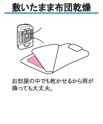 就寝前早めに布団を敷き、コンデンス除湿機を運転させれば、カラッとしてふっくらした布団になります。ハンバーや椅子などを使って、布団を床から浮かせるとより効果的です。外出がちでなかなか布団を干せないご家庭にもピッタリです。 |