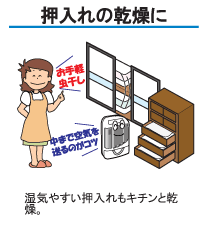 虫干しは着物を長持ちさせるために行う大切なこと。しかし、タンスへの出し入れは忙しいときには意外と大変なことです。そんなとき、引き出しを開けたままコンデンス除湿機を運転させれば、部屋ごと乾燥出来るので、虫干しの回数がグッと減らせます。同じように押入れを開けて除湿するという方法もあります。 |