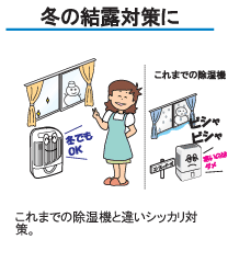 コンプレッサー除湿機は内部で冷やして結露させ、除湿するタイプなので冬は苦手です。一方、コンデンス式は湿気を乾燥剤で吸着するタイプなので冬でも強力に除湿乾燥ができます。冬のお部屋は閉め切りがちなので湿気は意外にこもりやすくなります。特に降雪地域では雪や低温のために湿気は多くなります。 コンデンス除湿機なら、冬場の結露対策にも使えます。 |