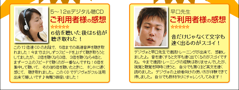 そのうえ可変高速再生機能を持つ「デジヴォ」を使用することにより、個人の実力に合わせ、無理なくトレーニングを行うことができ、初心者から上級者まで、幅広い速読ニーズに答えています。まさに「聴感速読トレーニング」は人間の権力の可能性を最大限に引き出すことができる、速読トレーニング方法のひとつであると言えるでしょう。