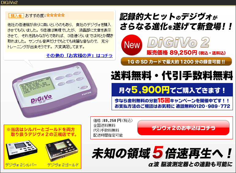 Digivoを購入してからは通勤の電車内でトレーニングができるようになり、重宝しております。また、倍速で音を聞くに当たって、音質が重要なウェイトを占めるといわれておりますが、Digivoの音質の良さにビックリしました。