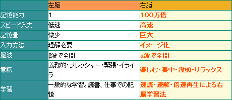 人間の左右の脳についての記憶能力は1(左):100万倍(右)と言われています。左脳は私たちが通常の読書や勉強をするように、理解を必要とするため低速で一度に憶えられる量も限られています。