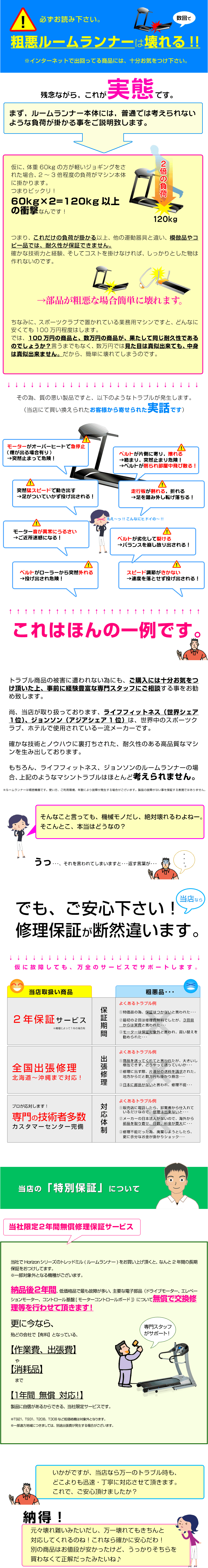 低価格なルームランナーは、すぐに故障してしまう傾向があると言われています。当店で取り扱うルームランナーは業務用のマシンを開発しているメーカーが製造しました。