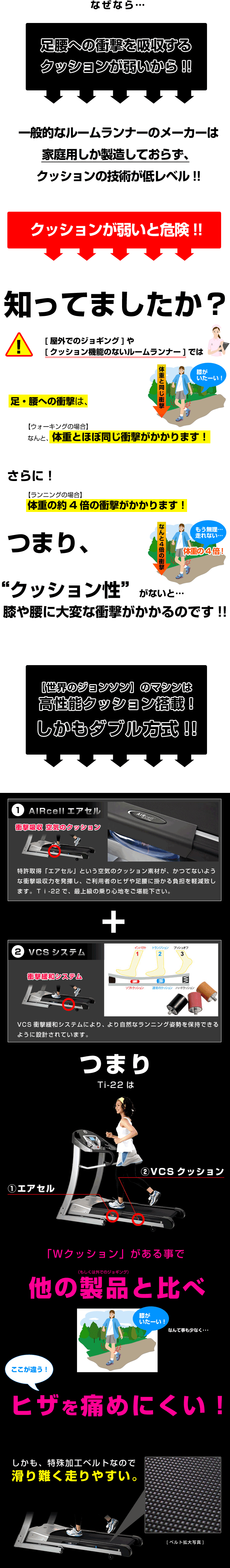 ヒザ関節に痛みを感じたらすぐにルームランナーを止めるだけ。いつでも中断できるので、悪化させずに適度な運動を続けることができます。