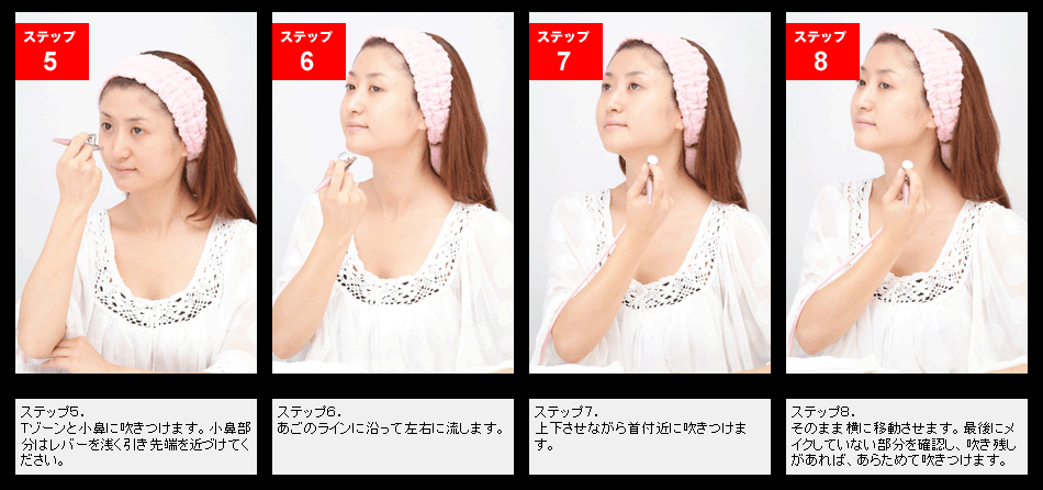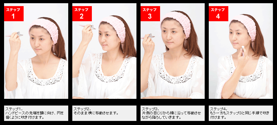 - ハンドピースの先端を額に向け、円を描くように吹き付けるます。