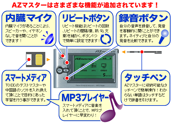 AZマスター商品構成 ●本体 ●英会話ブック ●リモコン ●携帯用ケース ●イヤホン ●取扱説明書 ●充電池 ●スマートメディア(32MB) ●クレイドル ●カードリーダー ●充電器兼用アダプター ●SMCフォーマット用CD ●プレゼントCD2枚 ●数で鍛える脳力パズル