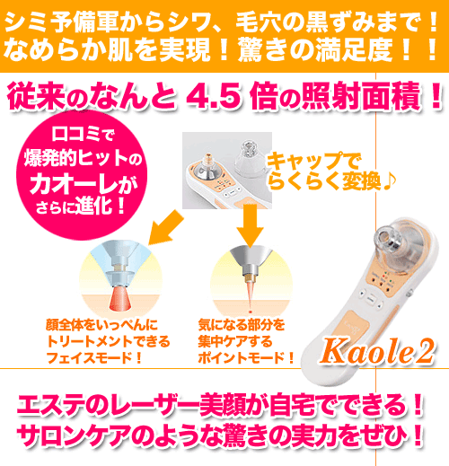 ●シミや黒ずみにお悩みの方に「レーザー美顔法」によりお肌を若返らせるという方法を行っているエステサロンがあります。しかしこの「レーザー美顔法」は非常に評判が良いのですが、1回当たり1万円以上とお値段が少し高めで、しかも10回程度はエステサロンに足を運ばなければいけません。そのエステサロンのノウハウをご自宅で誰でも簡単にできるのがこのカオーレです!!