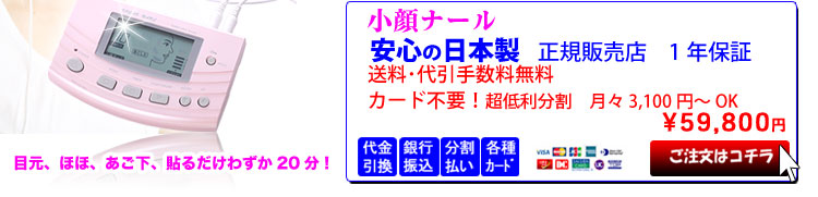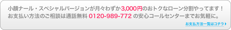 クレジットカードを使わず、お客様のご指定頂いた口座から、毎月自動的にお引き落としをさせて頂く分割払いになります。 今なら小顔ナール・スペシャルバージョンがわずか月々3,000円(24回払い)でご購入頂けます。 お引き落としは翌月からで、途中一括返済も可能です。 お申込時に簡単なお手続きが御座います。 ※ご不明な点はコールセンターまでお気軽にお問合せ下さい |