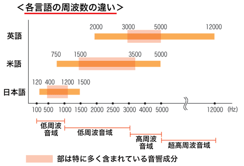 英語は子音が多く含まれるため、その周波数は日本人が普段慣れ親しんでいる日本語の周波数(400〜1200Hz)より高い周波数(3000Hz〜5000Hz)で構成されています。