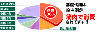 そして最も基礎代謝を消費するのが筋肉です。筋肉量を増やす事で、自然に消費エネルギーを増やす事ができます。 |