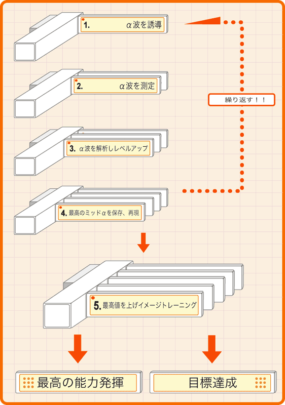 ミッドαの状態で「仕事、勉強やスポーツの活動時における「最高のパフォーマンス」や「目標達成状況」をイメージします。潜在脳にインプットされたイメージとミッドαがリンクして、活動時(仕事中、勉強中)にも最高の脳波が出せるようになります。