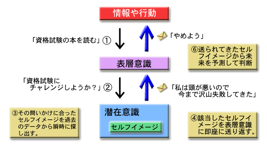 しかし、あなたのセルフイメージに「自分は頭があまりよくないが、こつこつ努力をしていろんな事を成就させてきた。今回もこつこつ頑張れば何とかなると思う。」とプログラミングされていればそういうイメージデータが潜在意識から瞬時に送られます。それに反応した表層意識は「よし、やってみよう」と意思表示をします。