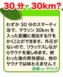 最高温度でスマーティを御利用頂いた場合でも、1日1回当たり11円とすると、一ヶ月毎日御利用頂いても、330円程度しかかかりません。エステや、銭湯などに通い続けてサウナを使うよりも、ずっとお得になりますね。エステサロンによっては、サウナ1回の御利用に数千円かかる場合もあります。