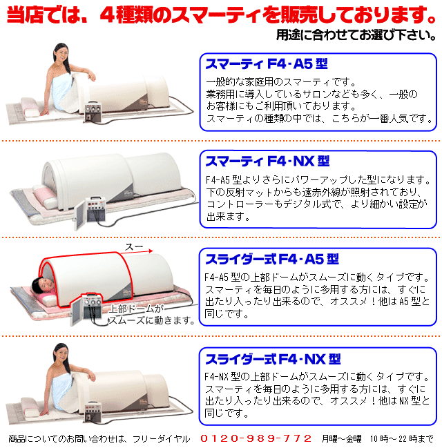 | 総評 | 一般的にスマーティと言えばこちらのスマーティF4-A5型です。 家庭用とはいえ、エステサロンなどでも使われていることもあります。 お気軽に自宅でサウナが体験出来、電気代などもほとんどかかりません。 ご両親へのプレゼントとしても良いのではないでしょうか。 |