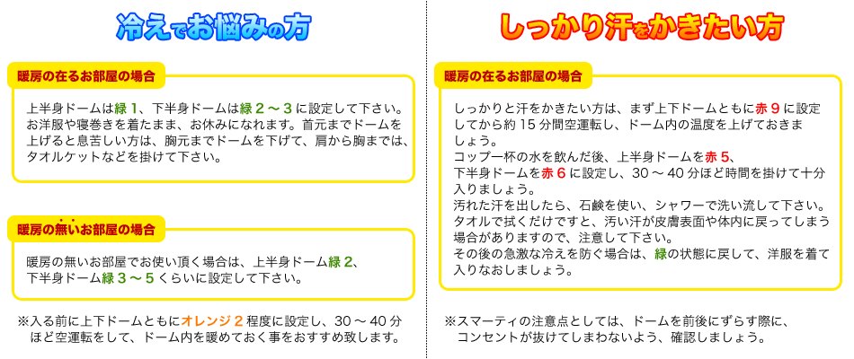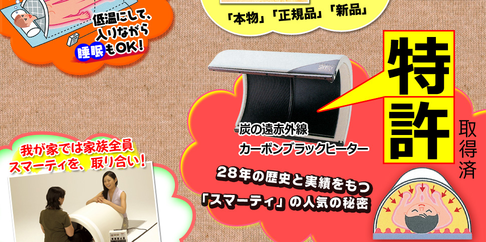 暖房器具などとの違いは実際にスマーティを御利用頂くと、お分かり頂けると思います。スマーティは、遠赤外線を使ったサウナなので、体の芯から温かくなります。