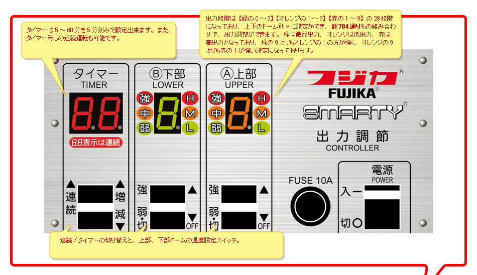 電子コントロール(上下別調整可能な高級型),カセット式(修理が容易),出力調整(28段階)とタイマー(最長60分)がオートデジタル。反射マットは20W固定。 |