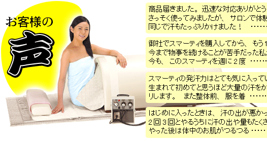 普段運動不足で、汗腺をあまり活発にしていない方は、汗が出にくいこともあるようです。しかし、ご安心下さい。継続的にスマーティを御利用頂ければ、沢山の汗を出せるようになるでしょう。