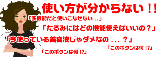 他の多機能美顔器(超音波やイオン導入等の複数の機能がある美顔器)では実際に使うときに「超音波モード」や「イオン導入モード」「イオン導出モード」といった機能をユーザー自身が使いこなさなければならなかったのです。